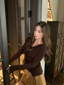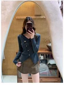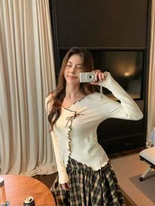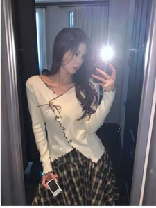 不退换E29055设计感不规则V领木耳边针织开衫女