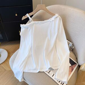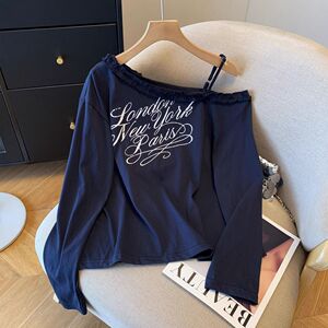 大码字母印花斜肩长袖t恤女秋季新款宽松露肩气质减龄花边领上衣