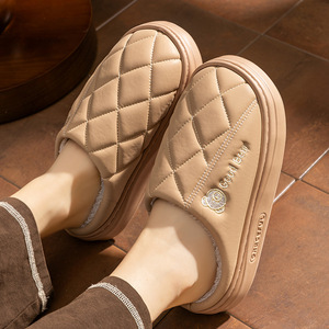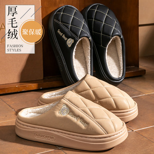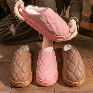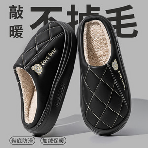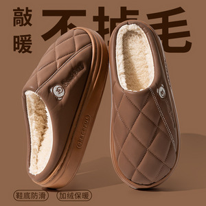 新款pu皮防水老年保暖防滑棉拖鞋厚底防滑eva卡通小熊情侣棉鞋