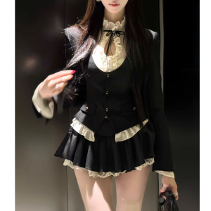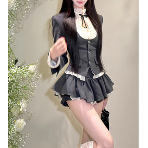 2025秋季轻职风西装套装设计感木耳边衬衫高腰蓬蓬裙三件套套装女