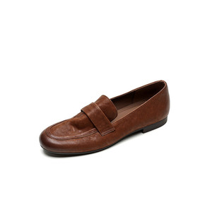 里外全皮小皮鞋头层牛皮圆头深口单鞋巨软乐福平底鞋复古一脚蹬潮