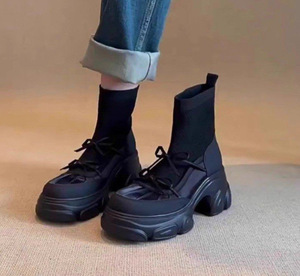 羊皮版~2025秋冬新款厚底弹力靴女英伦风拼接蝴蝶结松糕底瘦瘦靴