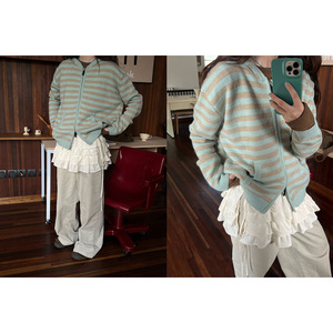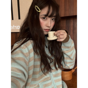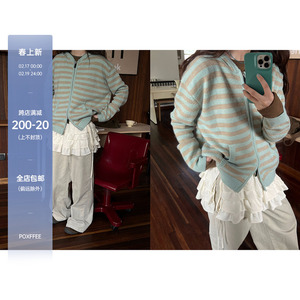 POXFFEE/条纹连帽针织衫毛衣开衫女秋冬新款复古宽松外搭针织外套