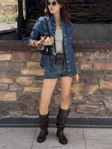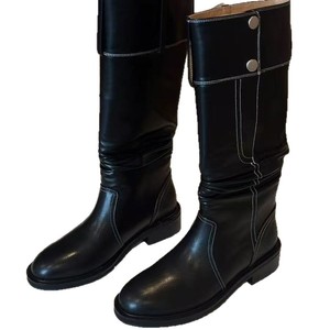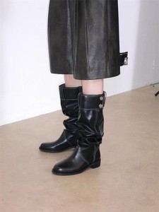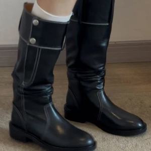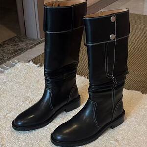 牛皮版~黑色复古纽扣高筒靴女2025秋冬不过膝褶皱堆堆靴百搭长靴