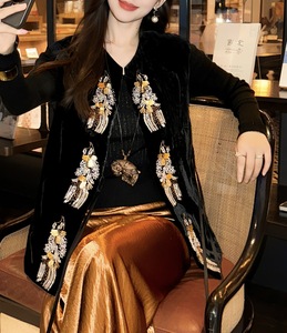 秋季新款真丝丝绒马甲重工立体钉珠刺绣手工流苏设计精致优雅马夹