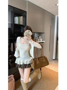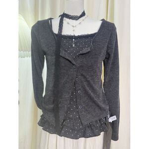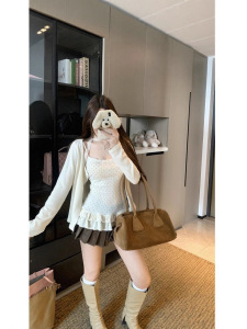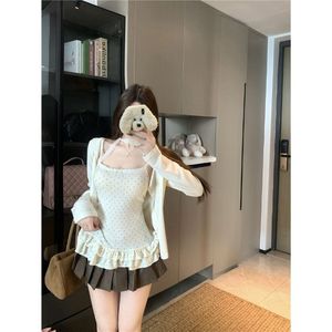 【工厂直销】人棉蕾丝拼接波点荷叶边吊带针织开衫两件时尚套装秋