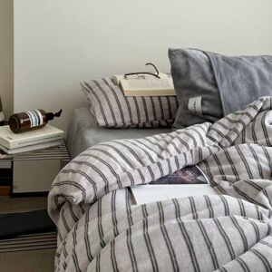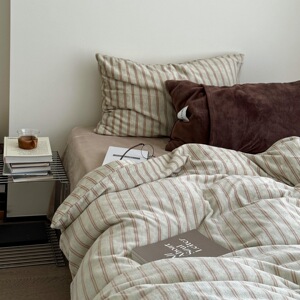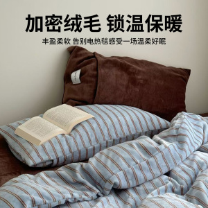 简约条纹牛奶绒床上四件套秋冬加绒被套学生宿舍保暖珊瑚绒三件套