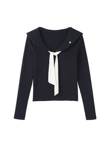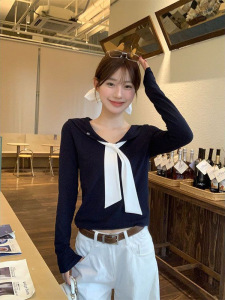 设计感娃娃领绑带长袖t恤女内搭短款修身早秋单穿韩系chic小上衣