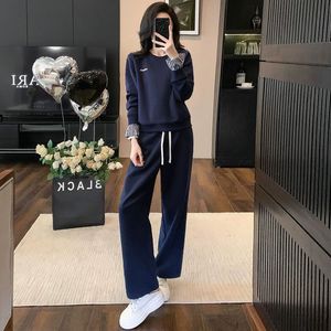 港风复古休闲套装女2025秋新款蓝色长袖圆领卫衣高腰阔腿裤两件套