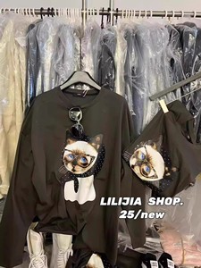 韩国东大门2025秋季新款韩版时尚宽松卡通猫咪印花圆领长袖T恤女