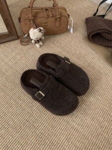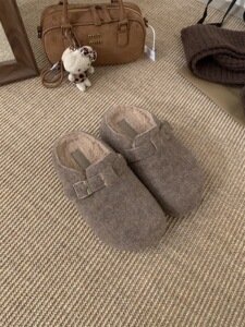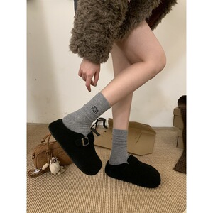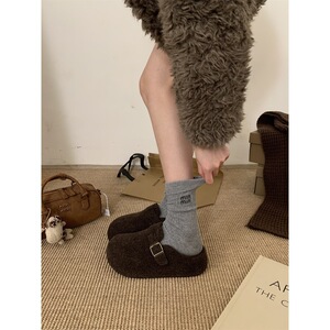 灰色丑萌面包鞋子女小个子厚底加绒勃肯鞋内增高5cm毛毛拖鞋