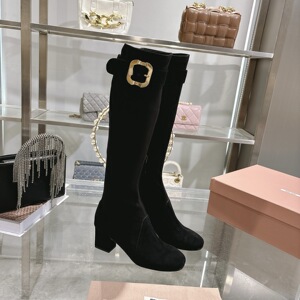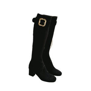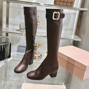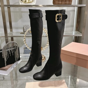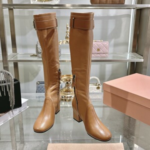 高端2025秋冬真皮圆头高跟过膝靴皮带扣粗跟高筒长靴瘦腿骑士靴女