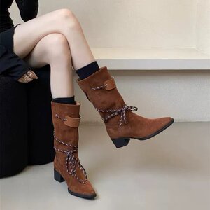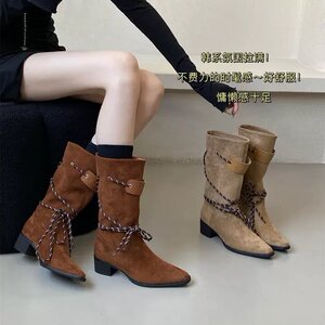 ALIGUIFEI中筒靴女粗跟西部骑士靴女尖头高筒不过膝牛仔长筒靴女
