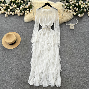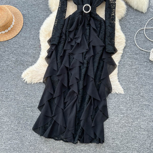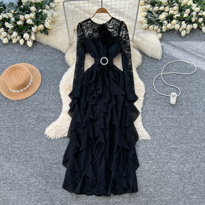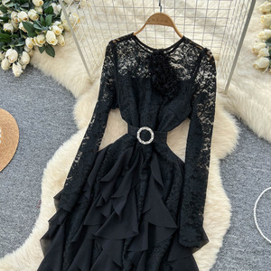 法式高级感立体花朵荷叶边拼接长袖蕾丝连衣裙女轻奢优雅礼服长裙