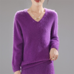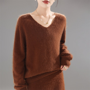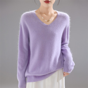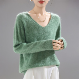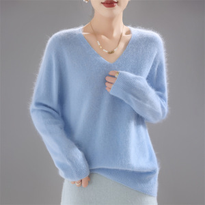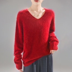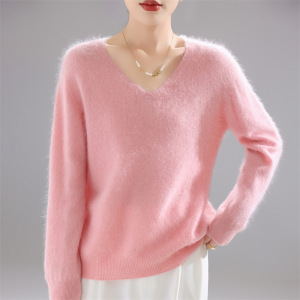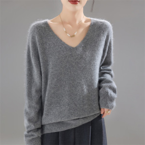 2025秋冬新款时尚宽松百搭V领女士100纯羊毛拉绒毛衣针织打底衫