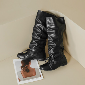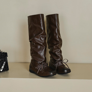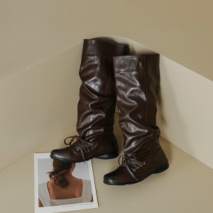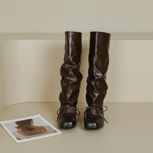 2025方头复古擦色做旧褶皱靴系带小众设计感粗跟舒适中筒靴堆堆靴