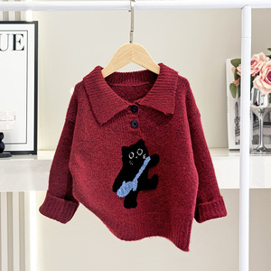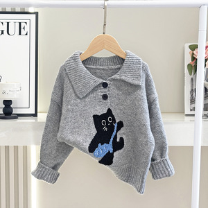 甜美女孩秋季新款毛衣2025女童韩系小猫针织翻领套头上衣秋冬装