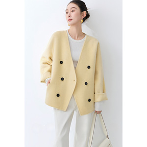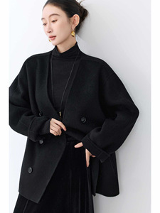 2025秋冬新款全羊毛大衣深V领松弛利落双排扣双面呢外套女装上衣