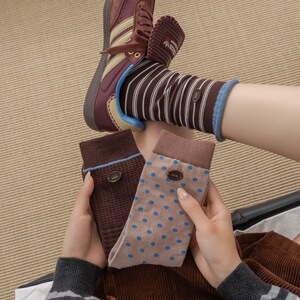 无骨中筒袜子女欧货复古波点条纹纽扣网红美拉德咖色系撞色堆堆袜