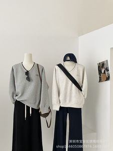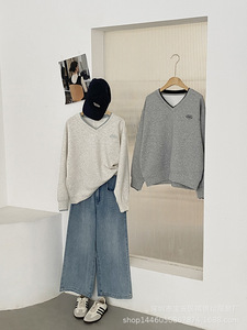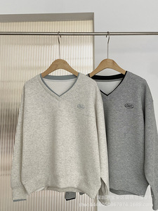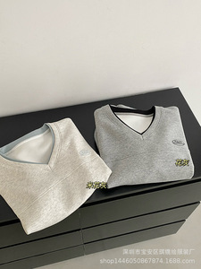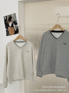 琪镌绘制秋季新款V领假两件刺绣空气层卫衣女宽松长袖上衣女2395
