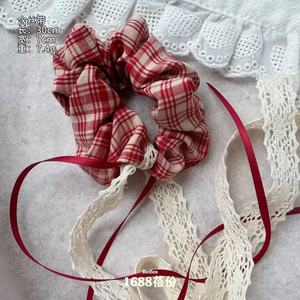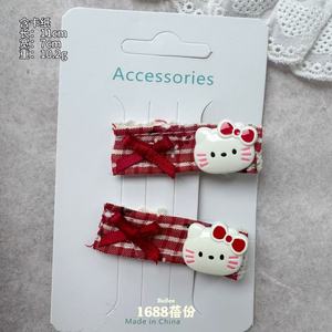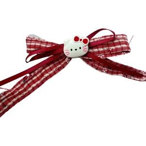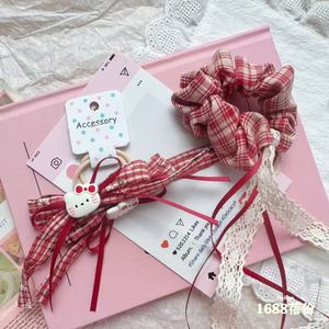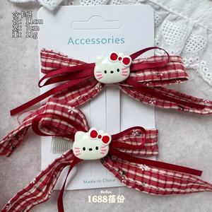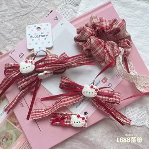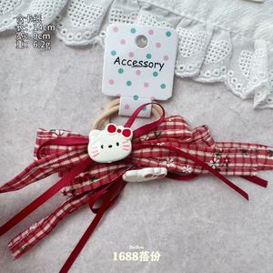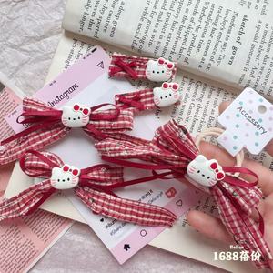 甜美蝴蝶结红色格纹猫咪布艺发夹儿童可爱韩版飘带发圈扎发皮筋女