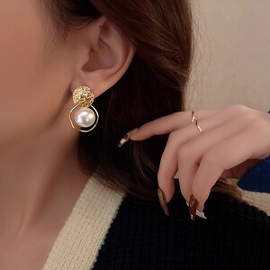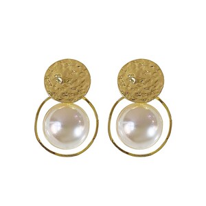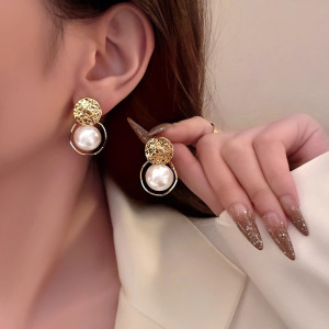 港风复古个性冷淡风金属感圆片耳环女时尚百搭大气珍珠耳钉耳饰品