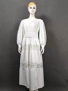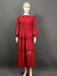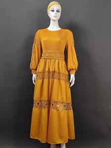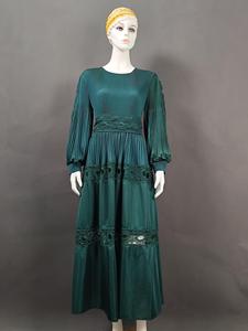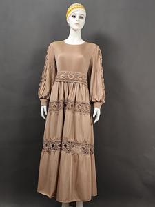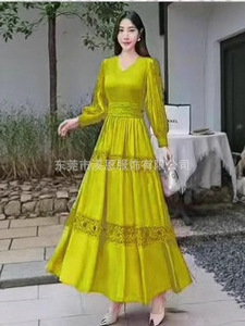 Miyaki新款法式时尚蕾丝花边拼接纯色圆领灯笼袖大码连衣裙跨境