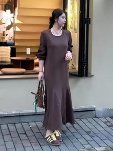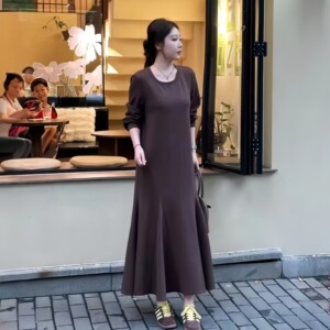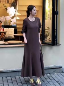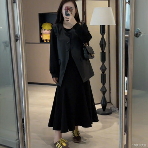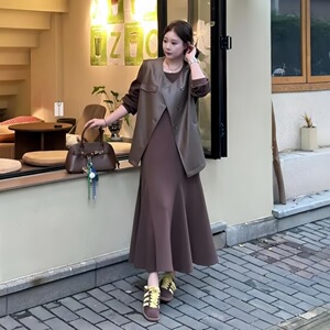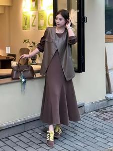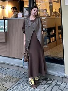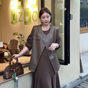大码坎肩无袖皮马甲背心+长袖连衣裙两件套女胖mm早秋穿搭一整套