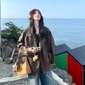 韩系深咖色复古港风皮衣外套女2025秋季新款通勤小个子机车服夹克