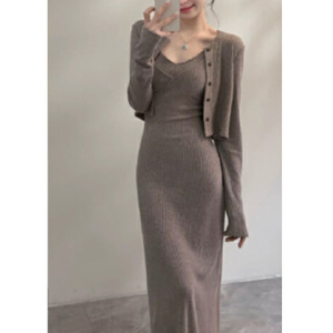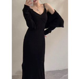 设计感时尚套装2025秋季开叉收腰法式长款连衣裙吊带裙+开衫长袖