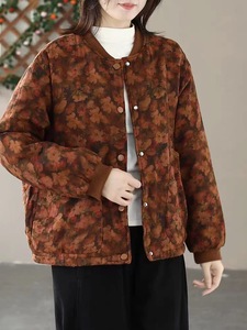 2025秋冬复古印花棉质夹棉外套棉衣女圆领宽松加厚保暖棉服上衣