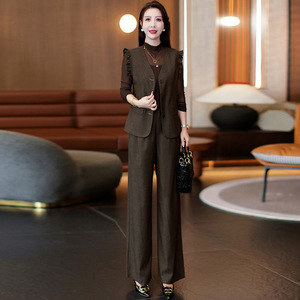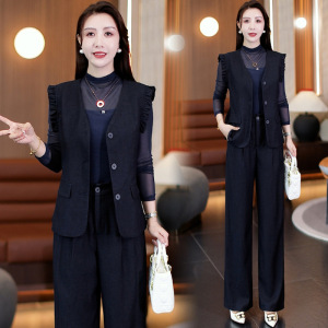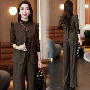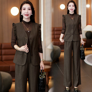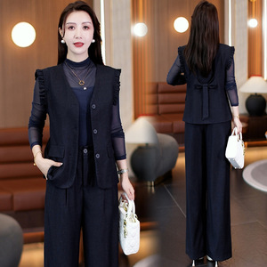 时尚套装女2025秋季新款洋气显瘦蝴蝶边马甲打底衫阔腿裤三件套