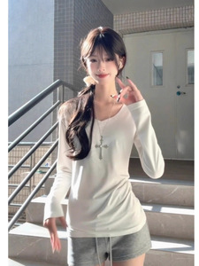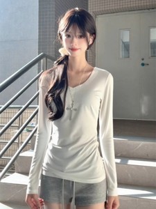 欲风白色辣妹V领百搭长袖T恤女秋季新款收腰显瘦正肩打底衫上衣潮
