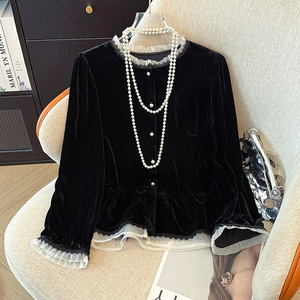 假两件上衣女时尚洋气妈妈衬衫长袖秋冬新款打底衬衣黑色丝绒小衫