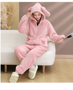 珊瑚绒睡衣女秋冬季加绒加厚网红风新款爱心口袋法兰绒家居服套装