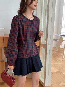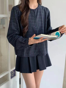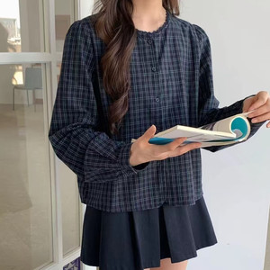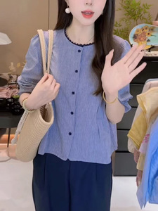 韩版条纹圆领长袖衬衫女2025秋季新款设计感拼接时尚减龄百搭小衫