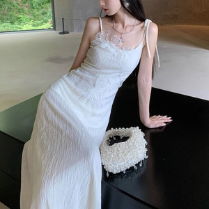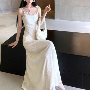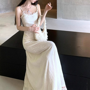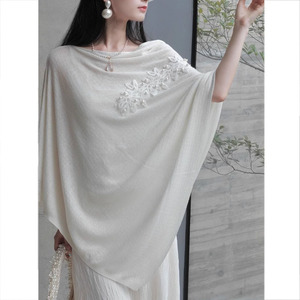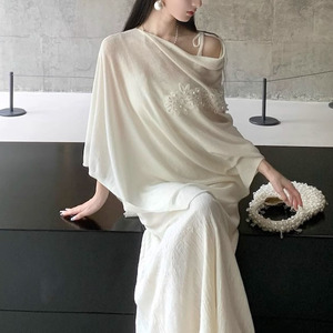 法式千金风珍珠花朵针织披风+立体镶花修身针织拼接吊带系带长裙