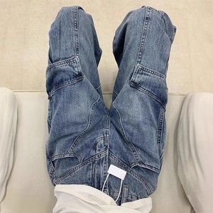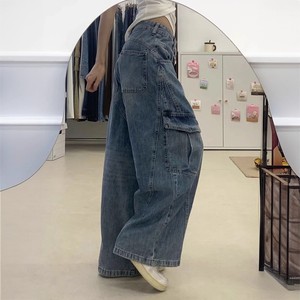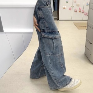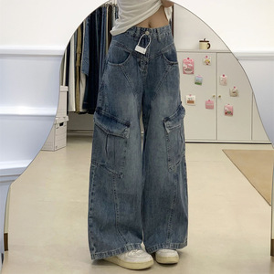 美式复古工装牛仔裤女新款设计感高腰分割多口袋宽松直筒阔腿裤子