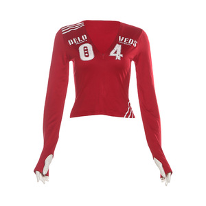 时尚欧美夏季跨境2025新款V领潮流字母印花修身显瘦百搭T恤上衣女