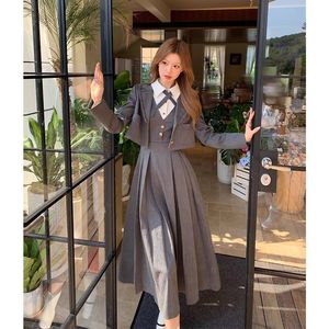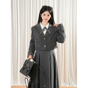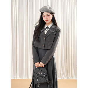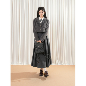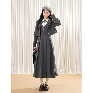 少女诗集 学院风衬衫假两件收腰百褶连衣长裙+气质韩系短外套套装