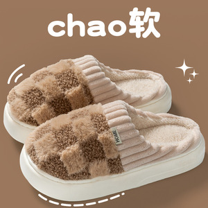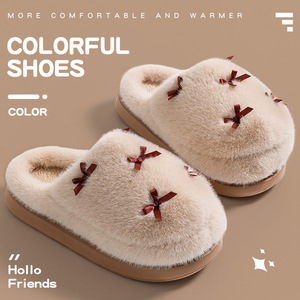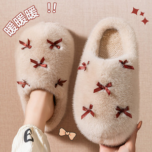 毛绒棉拖鞋女款2025新款秋冬室内室内家居加厚保暖防滑蝴蝶结棉拖