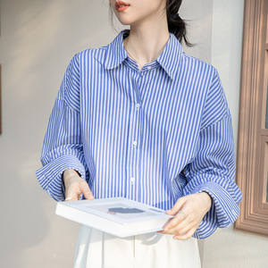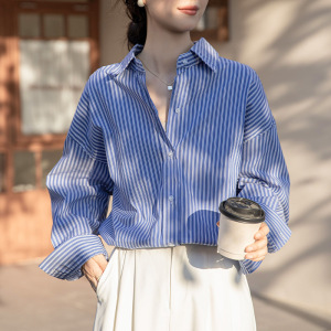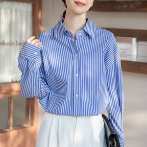 条纹衬衫女装2025秋冬新款薄款宽松Polo领通勒衬衣长袖上衣女外穿