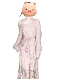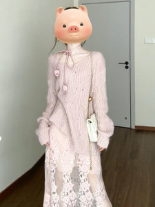 温柔风粉色慵懒软糯露肩针织开衫蕾丝半身裙女秋装设计感两件套装