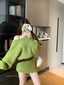 韩系绿色斜肩长袖针织连衣裙女秋季显瘦高腰毛衣短裙温柔包臀裙子