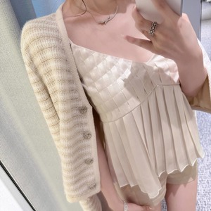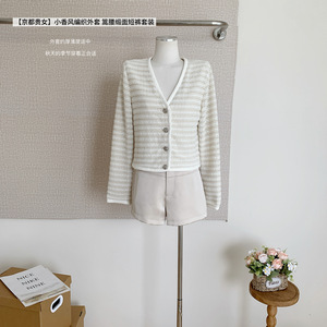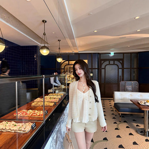 韩雨嘉京都贵女小香风编织外套 仿醋酸吊带 高腰缎面短裤套装