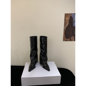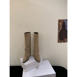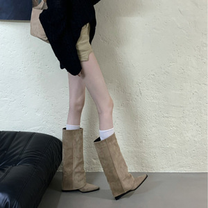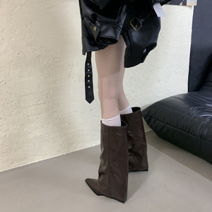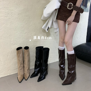 韩系设计感尖头坡跟裤管靴2025秋季新款套筒瘦瘦靴