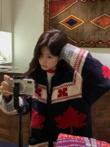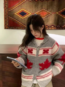 韩国复古提花拉链翻领毛衣外套女秋冬新款宽松休闲减龄针织开衫厚