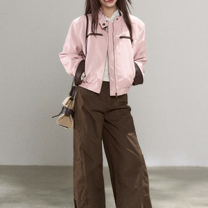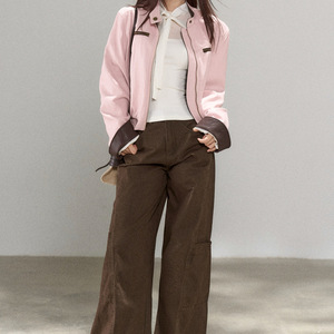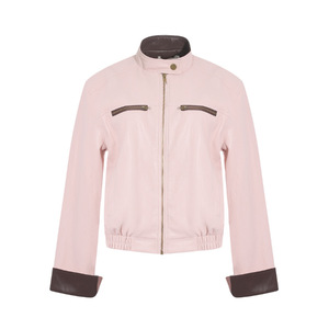 韩系甜美温柔风拼接撞色粉色皮衣外套女秋季新款休闲百搭立领夹克
