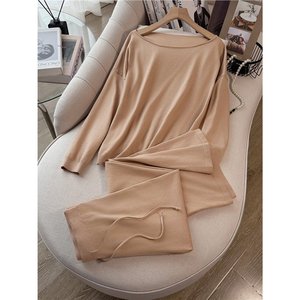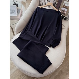 深圳南油温柔风针织休闲套装女秋季一字肩上衣阔腿裤运动风两件套