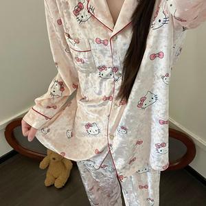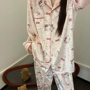 甜美HelloKitty睡衣女秋季2025新款大码冰丝绸长袖卡通家居服套装